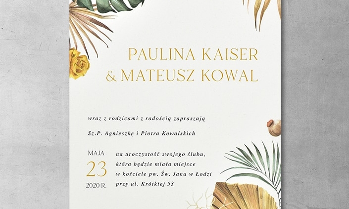 Zaproszenia tropikalne to część znacznie większego trendu na zaproszenia ślubne zielone i botaniczne. Roślinne motywy, czy to pod postacią kwiatów czy liści, występują w wielu wariantach. Zielone zaproszenia o tropikalnym charakterze będą przede wszystkim charakteryzowały się doborem odpowiednio egzotycznych gatunków. Jednym z najpopularniejszych są oczywiście liście monstery, ale zaproszenia tropikalne oferują znacznie więcej – liście palm, orchidee, strelicje i inne kolorowe okazy, wszystkie o energetycznych, nasyconych barwach. To kolejna cecha zaproszeń ślubnych tropikalnych – żywe kolory wyraźnie odcinające się od bardzo jasnego (białego lub kremowego) lub bardzo ciemnego tła. Dzięki kontrastowi całość nabiera dynamicznego wydźwięku. Dodatkowo zaproszenia tropikalne często łączone są z innym popularnym motywem zaproszeń ślubnych – geometrycznymi figurami, zazwyczaj pokrytymi złotą folią, która świetnie współgra z bogatą paletą barw całości.