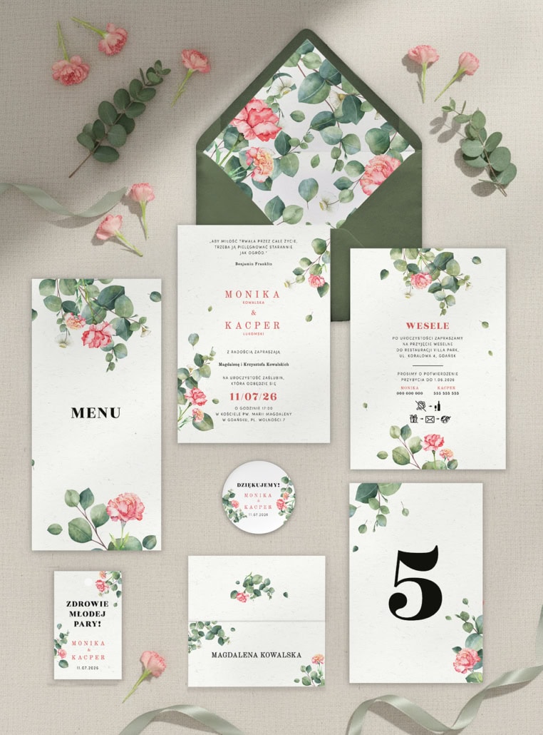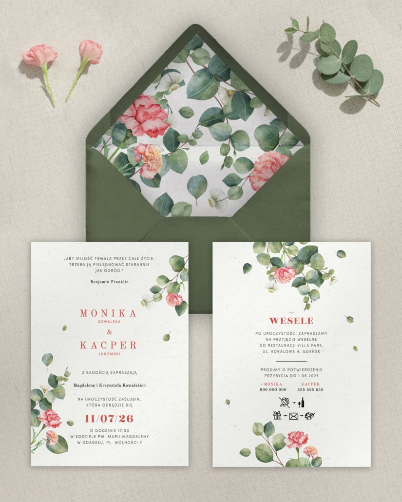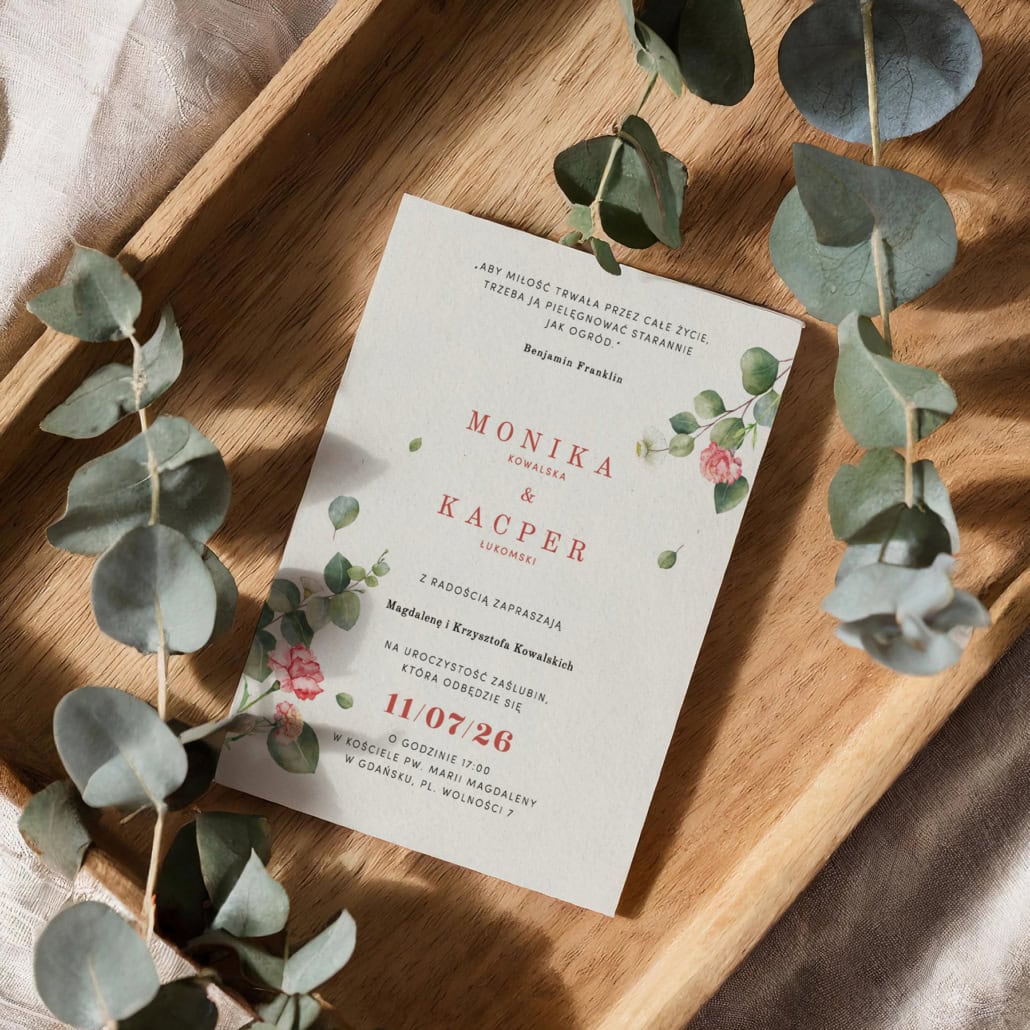 Zaproszenia ślubne Eukaliptus i goździk
