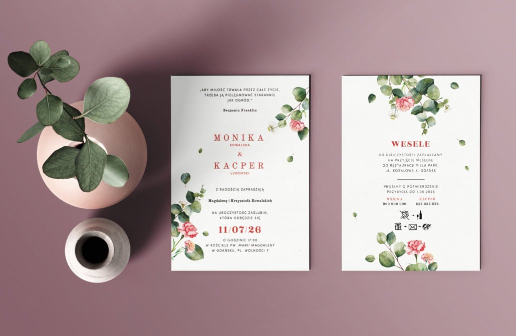 Czysta typografia i minimalistyczny układ nadają całości nowoczesnego charakteru, czyniąc te zaproszenia idealną zapowiedzią uroczystości w stylu naturalnym, boho czy klasycznym.
