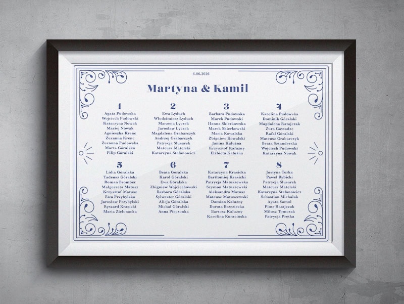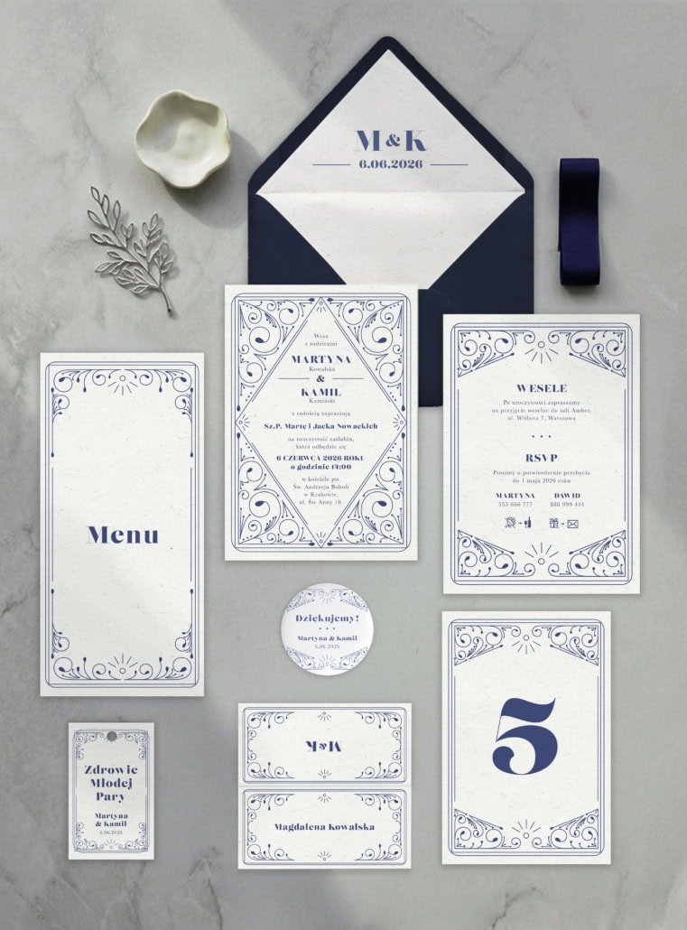 Spójna kolekcja papeterii obejmuje zaproszenie główne oraz dodatki widoczne na zdjęciach, takie jak karta RSVP, karta wesela, menu, numer stołu, winietka, zawieszka i plan stołów. Jednolita stylistyka z charakterystycznym motywem filigranowym tworzy wyrafinowaną oprawę uroczystości.