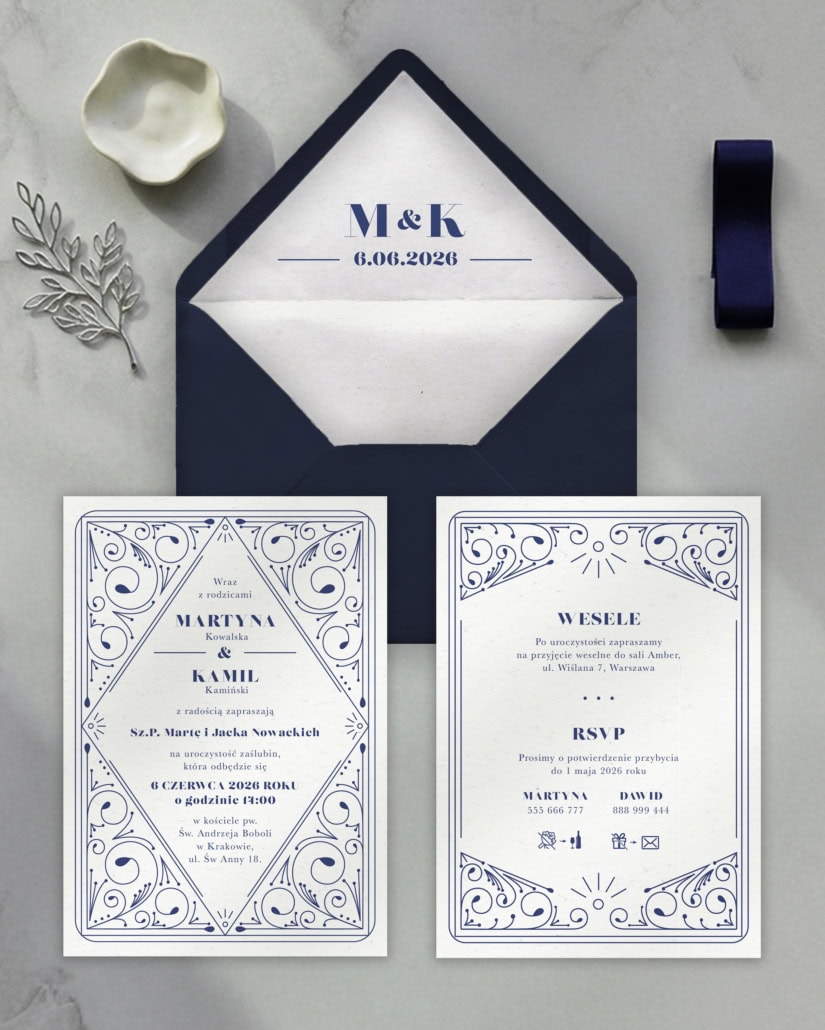 Koperty pasujące do zaproszenia: granatowa i granatowa perłowa.