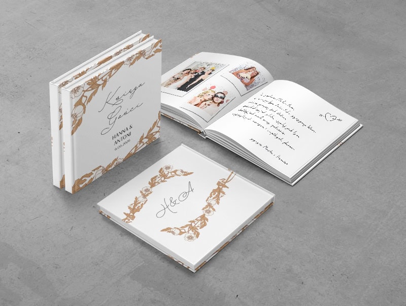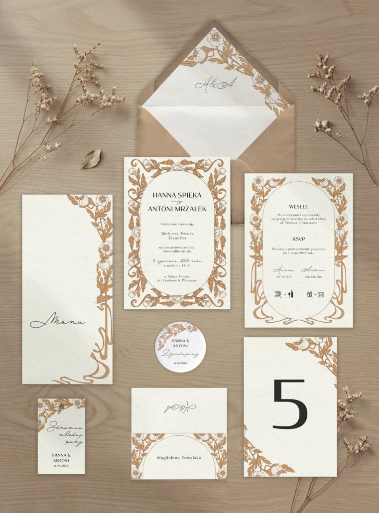 Spójna kolekcja papeterii obejmuje zaproszenie główne oraz dodatki widoczne na zdjęciach, takie jak karta RSVP, karta wesela, menu, winietki, numery stołów, zawieszki oraz plan stołów. Florystyczna stylistyka pozwala stworzyć harmonijną i dopracowaną oprawę całej uroczystości.