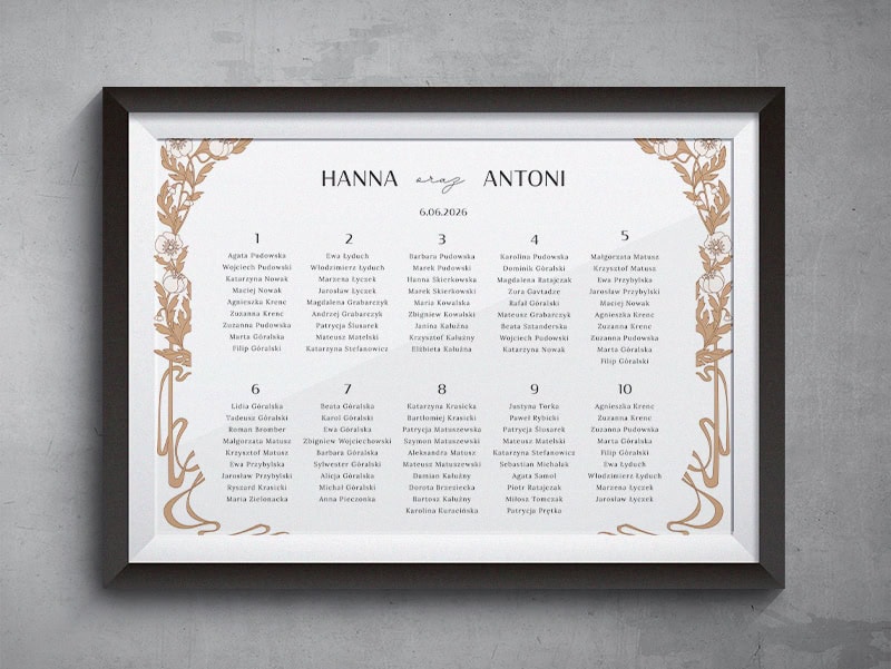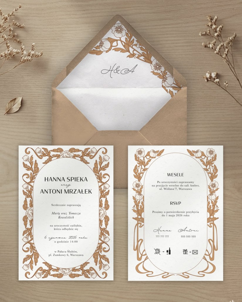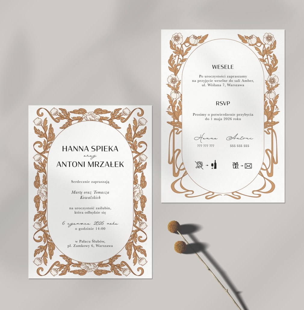 Projekt cechuje się dekoracyjną ramą z motywów kwiatowych i liściastych, utrzymanych w ciepłym, naturalnym odcieniu brązu. Centralny owal subtelnie porządkuje treść i podkreśla elegancki, romantyczny charakter projektu.