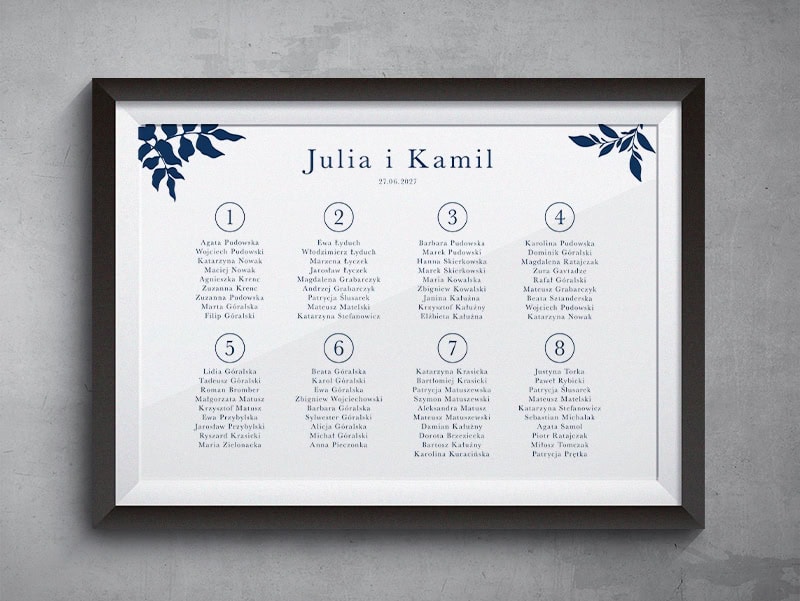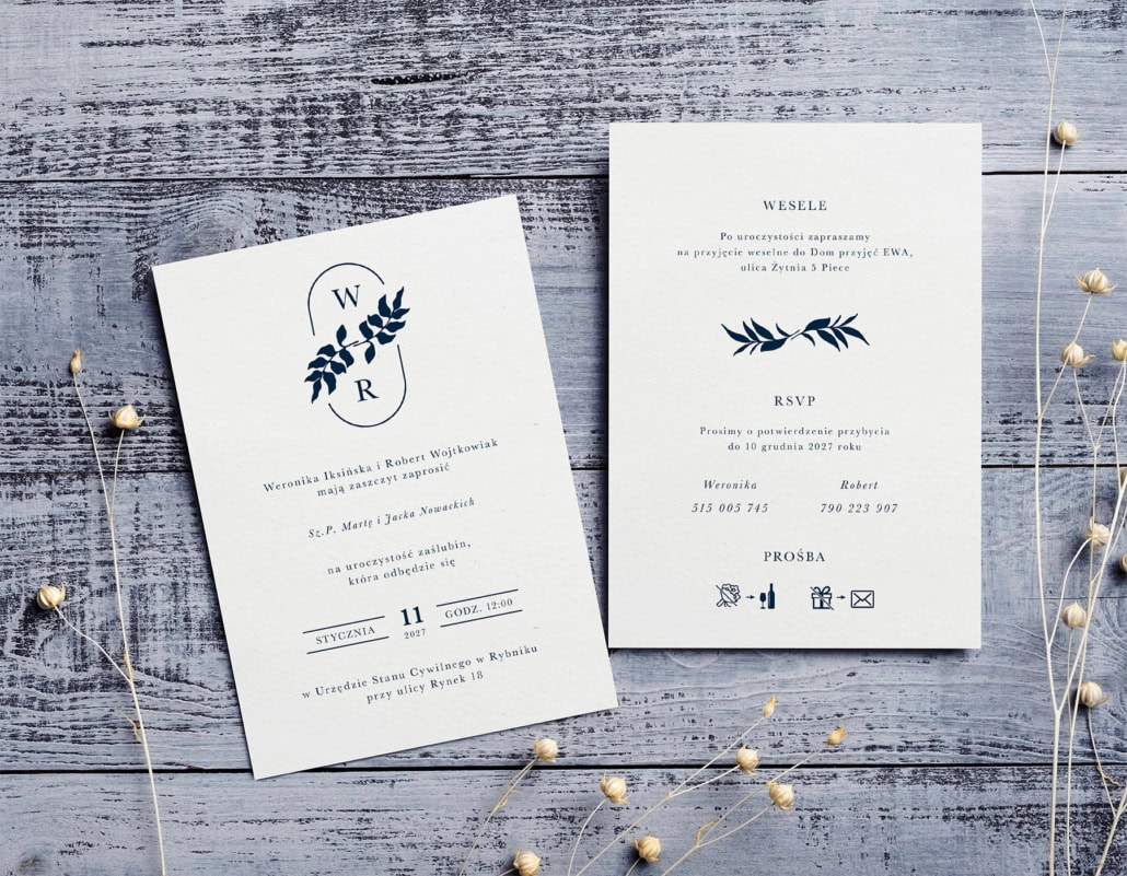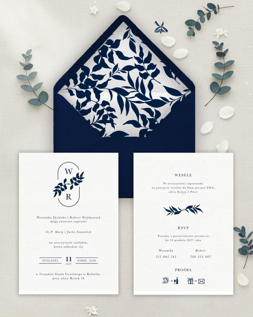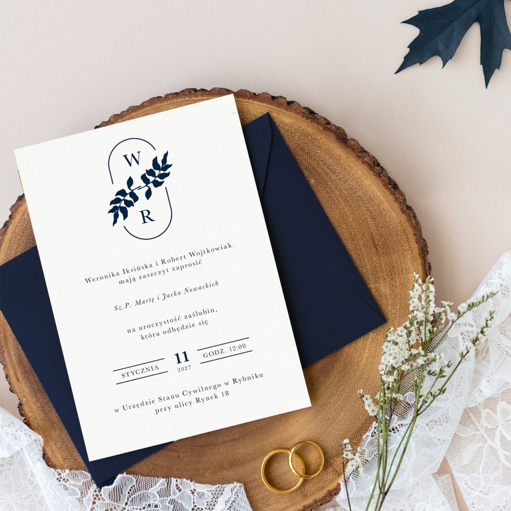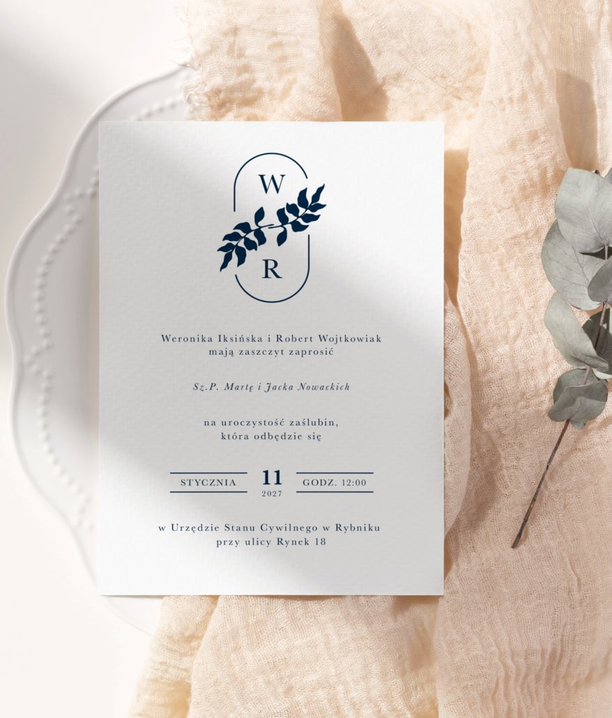 Ten wyjątkowy projekt łączy w sobie czystą formę z głęboko osobistym akcentem, tworząc zaproszenie pełne klasy i wyrafinowania. Centralnym punktem kompozycji jest personalizowany monogram z inicjałami Pary Młodej, subtelnie opleciony delikatną, botaniczną gałązką w nasyconym, granatowym kolorze.
