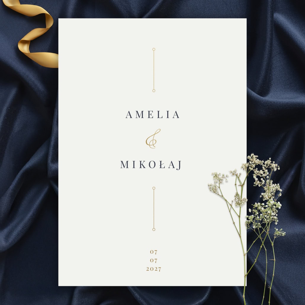 Ekskluzywna papeteria weselna dla tych, którzy wiedzą, że prawdziwy luksus nie krzyczy – on szepcze. „Granatowo-złoty minimalizm” to jak biżuteria na tle nocnego nieba; połączenie głębokiego granatu z lśniącym złotem to synonim ponadczasowej klasy.