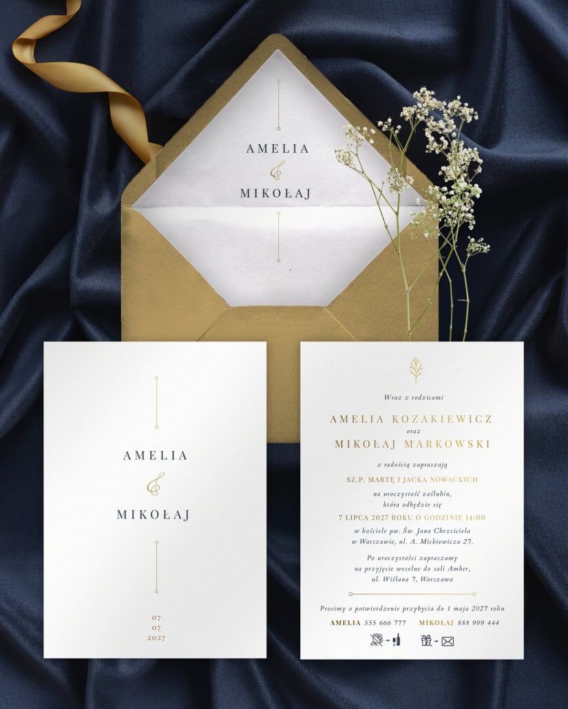 Koperty pasujące do zaproszenia: złota i granatowa perłowa.