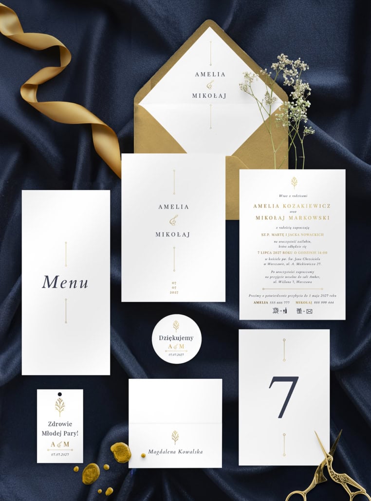 Kolekcja „Granatowo-złoty minimalizm” to kwintesencja nowoczesnej elegancji i luksusu w najczystszej postaci. Projekt łączy w sobie głęboki, szlachetny granat czcionek z lustrzanym blaskiem prawdziwej, złotej folii, tworząc ponadczasowe zestawienie kolorystyczne.