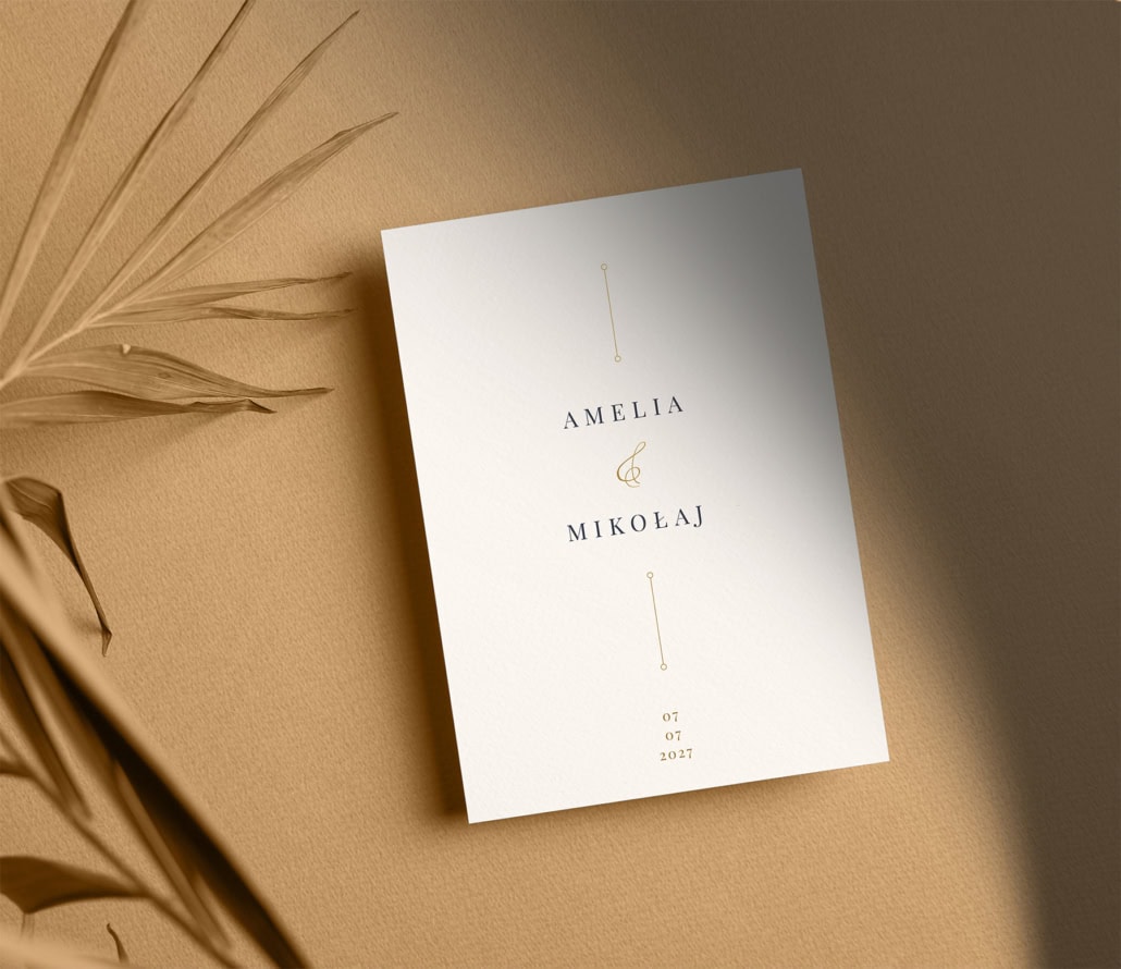 Czysty, niemal architektoniczny układ i minimalistyczne detale na aksamitnym papierze tworzą zapowiedź pełną klasy, idealną dla par ceniących wyrafinowaną prostotę w stylu glamour.