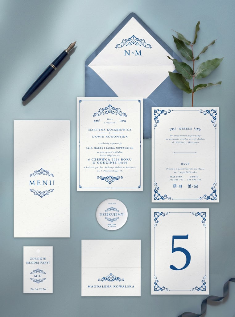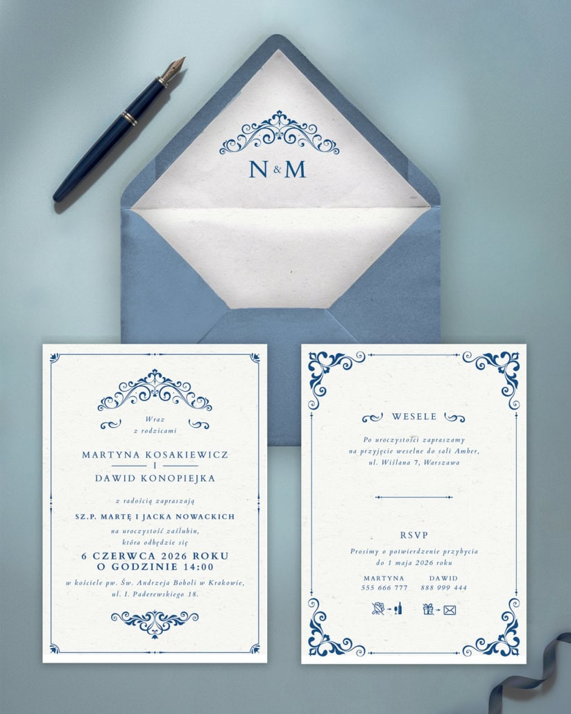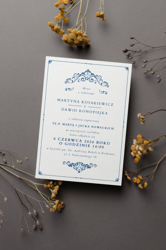 Szlachetne ornamenty pięknie kontrastują z czystą bielą wysokiej jakości papieru o wyczuwalnej fakturze. Starannie dobrana, klasyczna typografia dopełnia dzieła, tworząc zaproszenie pełne harmonii, klasy i uroczystego nastroju.