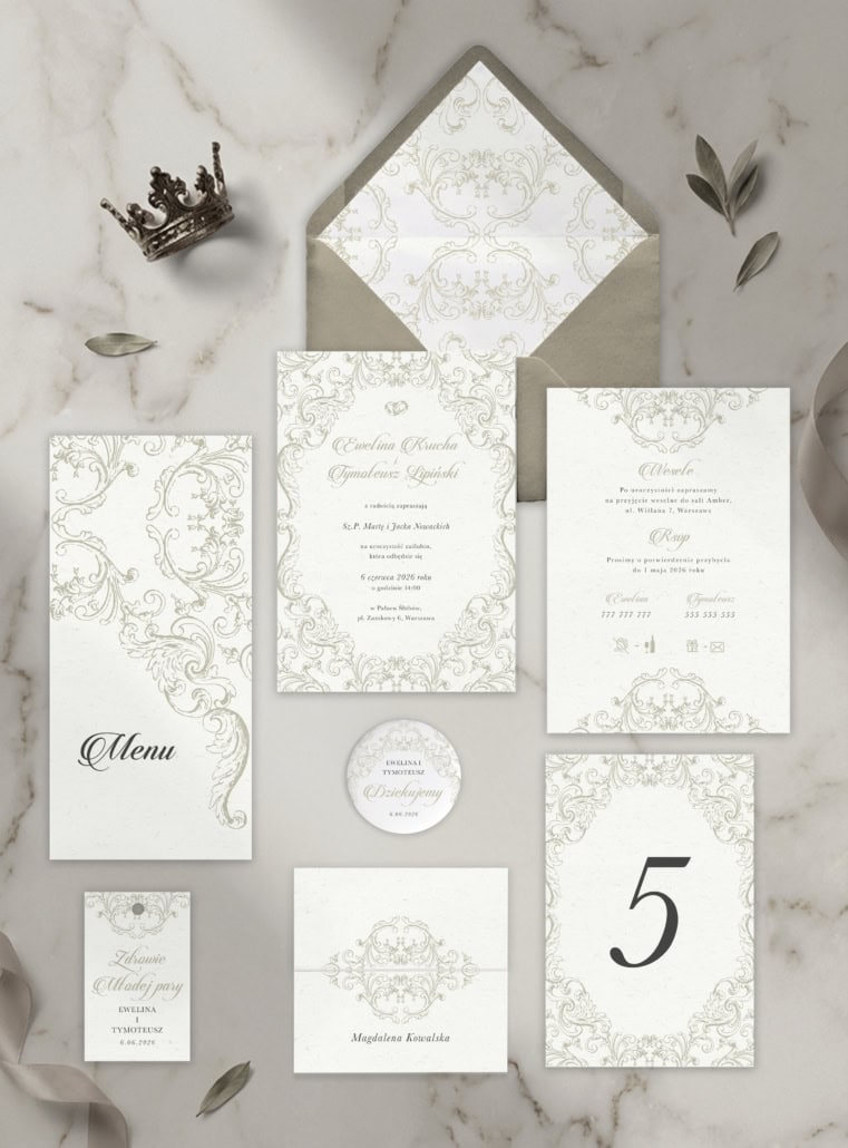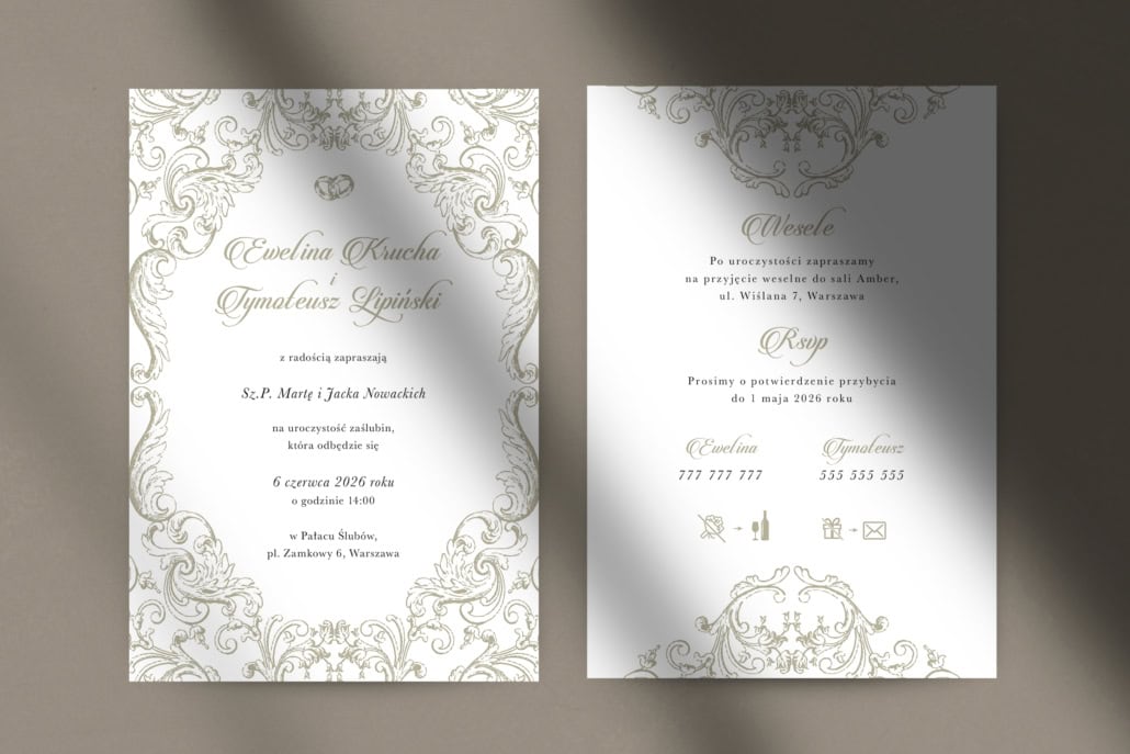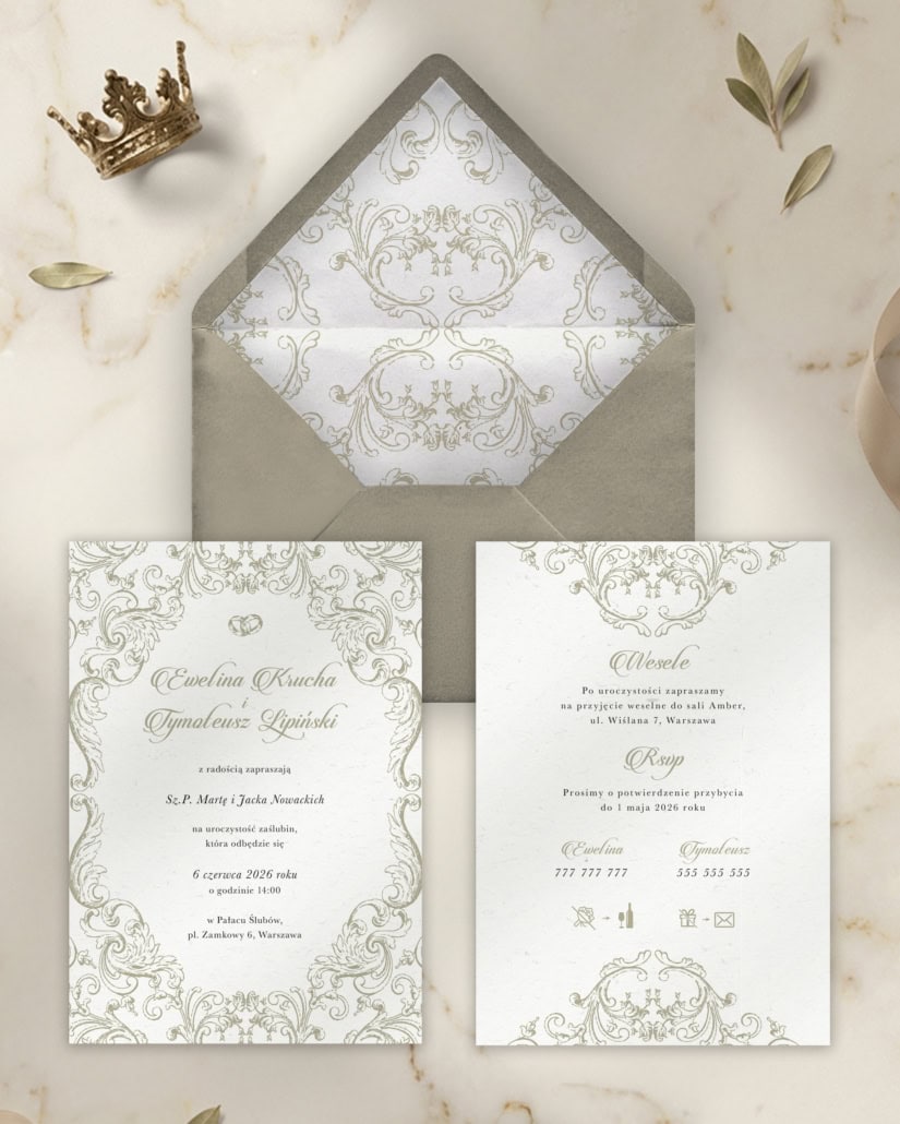 Zaproszenie ślubne „Królewskie” wyróżnia się dekoracyjnymi, roślinnymi ornamentami rozmieszczonymi symetrycznie wokół treści. Delikatny odcień zieleni wpadający w szałwię i oliwkę pięknie kontrastuje z jasnym, kremowym tłem, podkreślając uroczysty charakter zaproszenia.