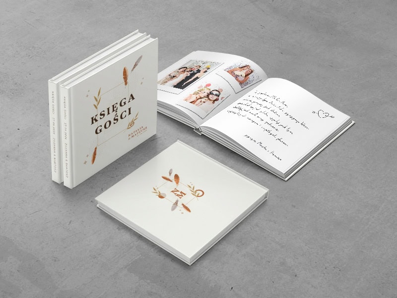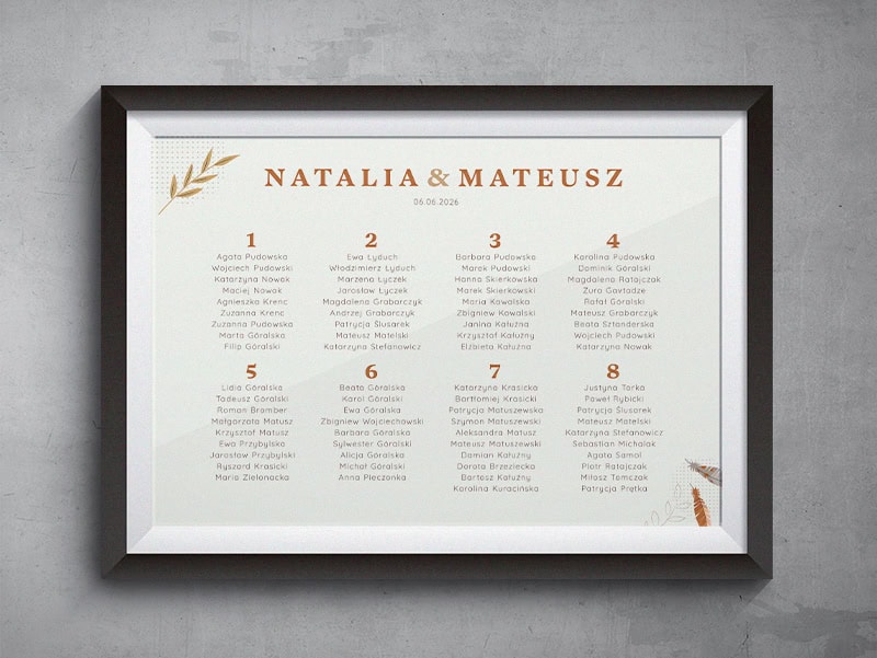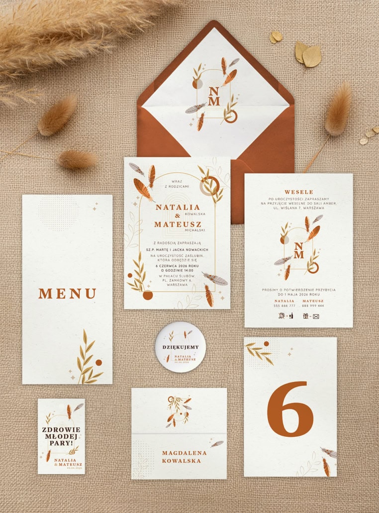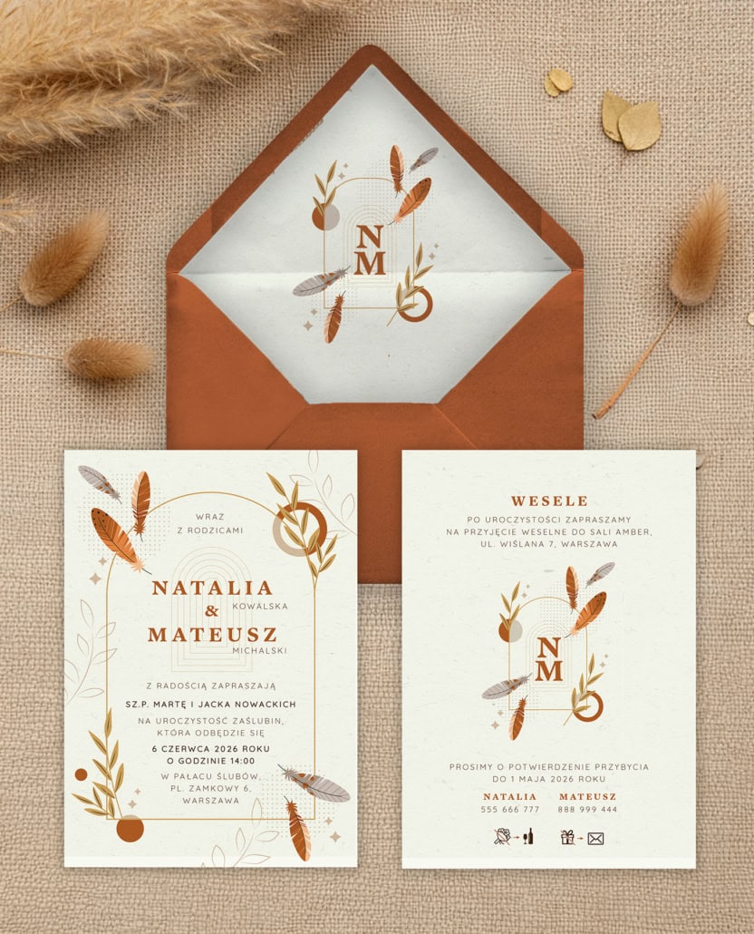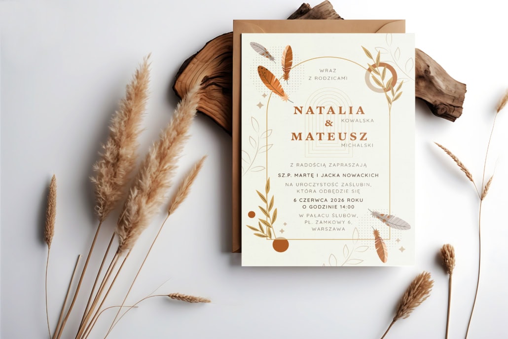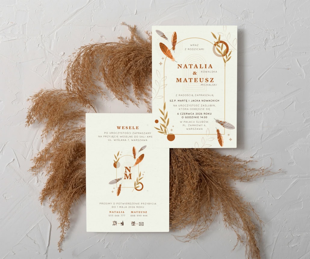 Całość skąpana jest w ciepłej, modnej palecie barw ziemi – dominuje tu terakota, karmelowy brąz i odcienie beżu. Nowoczesna, szeryfowa typografia dodaje projektowi klasy i doskonale współgra z artystycznymi elementami. To idealny wybór dla par ceniących trendy, lekkość i niebanalne połączenia, które marzą o ślubie w wyrafinowanym stylu boho.