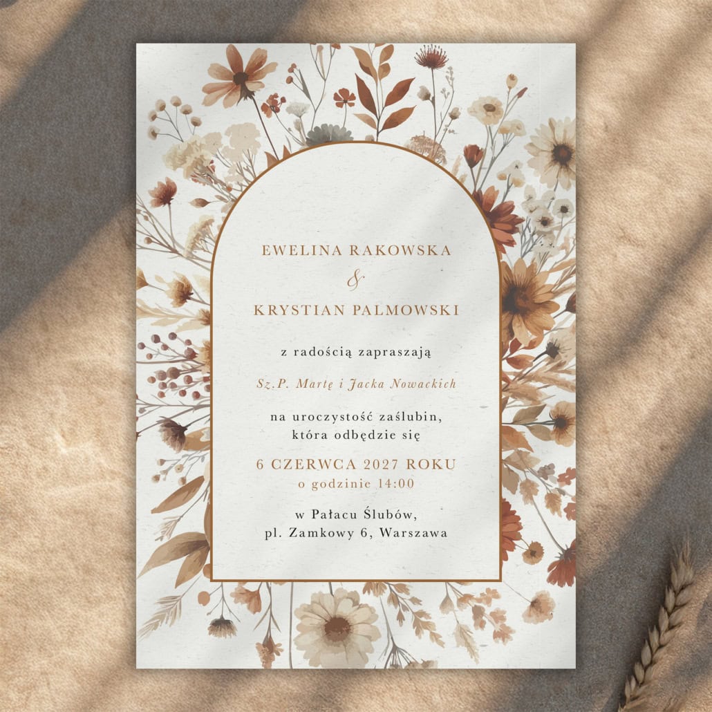 To zaproszenia, które pachną suszonymi kwiatami i trawami, utrwalone w ciepłych barwach ziemi. To nie tylko papeteria – to obietnica uroczystości pełnej miłości, ciepła i spokoju.
