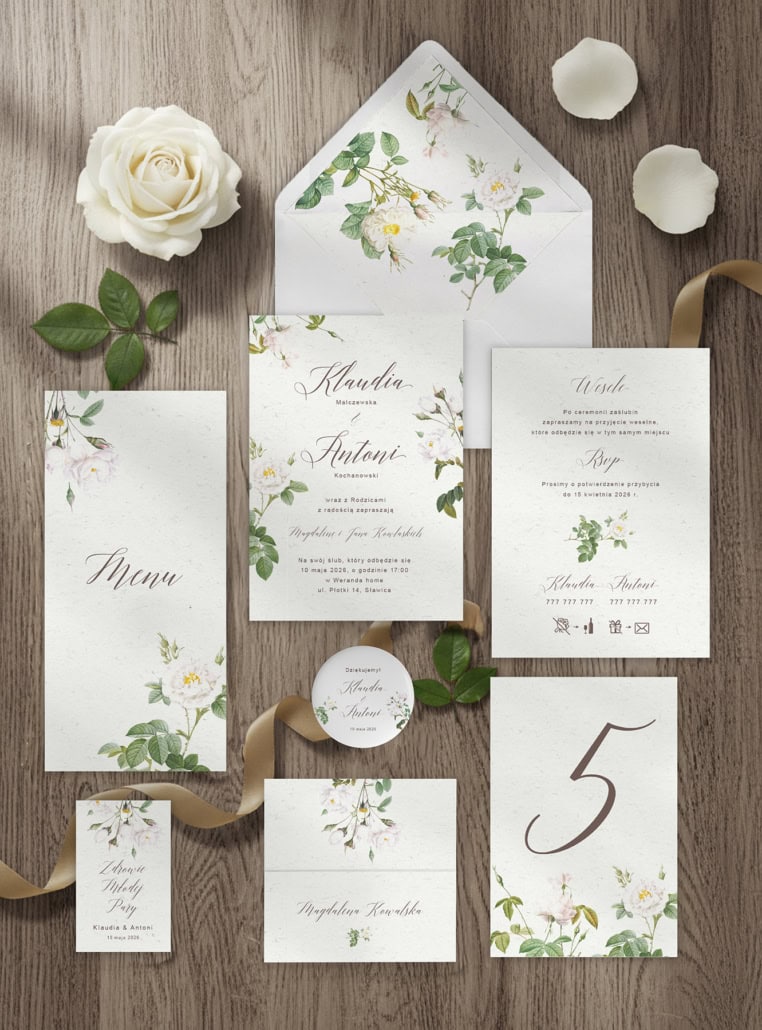 Kolekcja „Subtelne róże” to hołd dla ponadczasowej elegancji i klasycznego romantyzmu. Projekt łączy w sobie delikatność botanicznych rycin, przedstawiających pąki białych i kremowych róż, z niezwykle finezyjną, kaligraficzną czcionką.