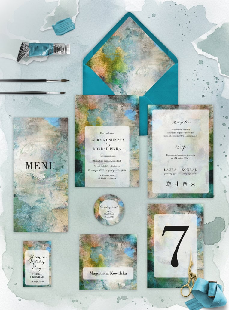 Przedstawiamy kolekcję „W stylu artystycznym” – papeterię ślubną, która jest jak abstrakcyjne dzieło sztuki. To projekt dla par, które poszukują designu wykraczającego poza schematy i pragną odzwierciedlić swoją artystyczną duszę. Głębokie, chłodne odcienie turkusu, błękitu i szmaragdu, przełamane ciepłymi akcentami ochry i rdzy, tworzą ekspresyjną kompozycję inspirowaną nowoczesnym malarstwem.