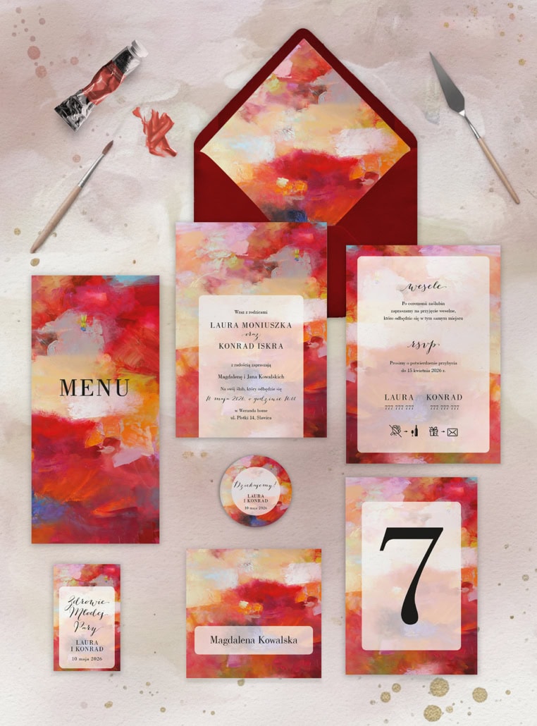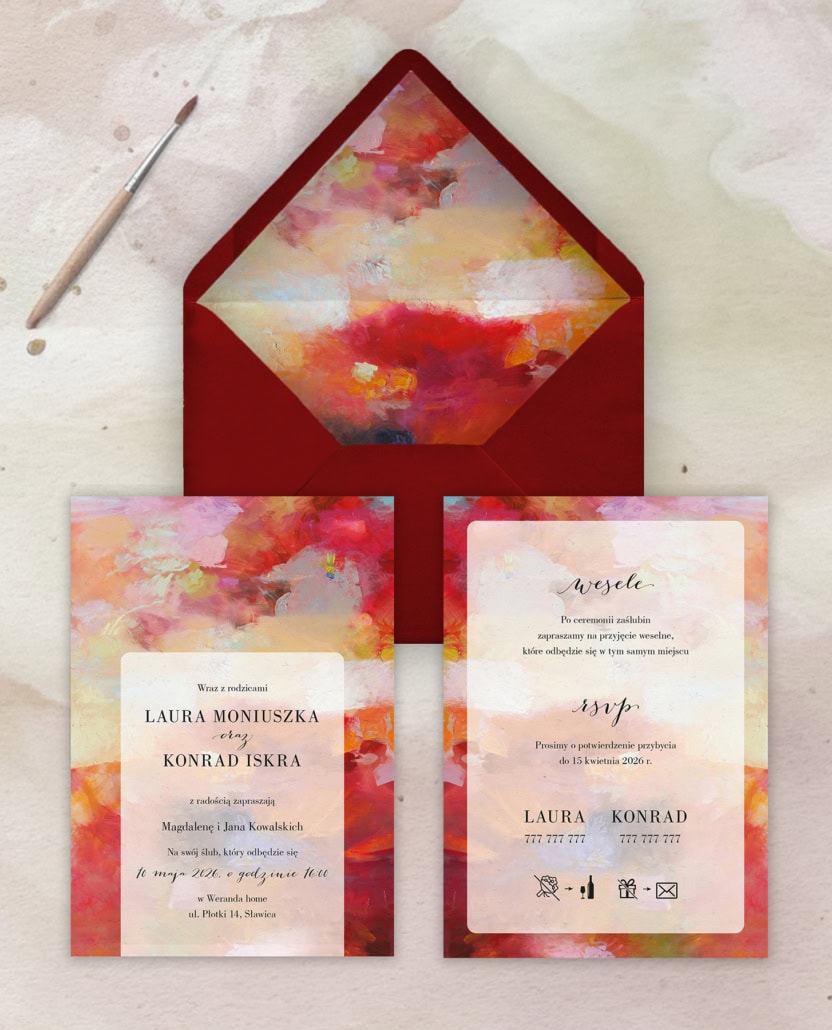 Przedstawiamy zaproszenia ślubne, które są prawdziwym dziełem sztuki. Kolekcja „W stylu artystycznym (ciepłe)” to hołd dla ekspresyjnego malarstwa, idealny dla par pragnących wyróżnić się niebanalną estetyką. Tło, przypominające pociągnięcia pędzla i szpachelki, skąpane jest w głębokich, ciepłych barwach burgundu, nasyconej pomarańczy i akcentów złota, tworząc atmosferę pasji i elegancji.
