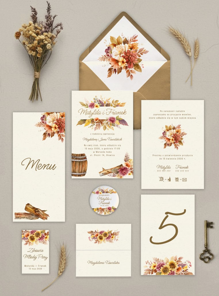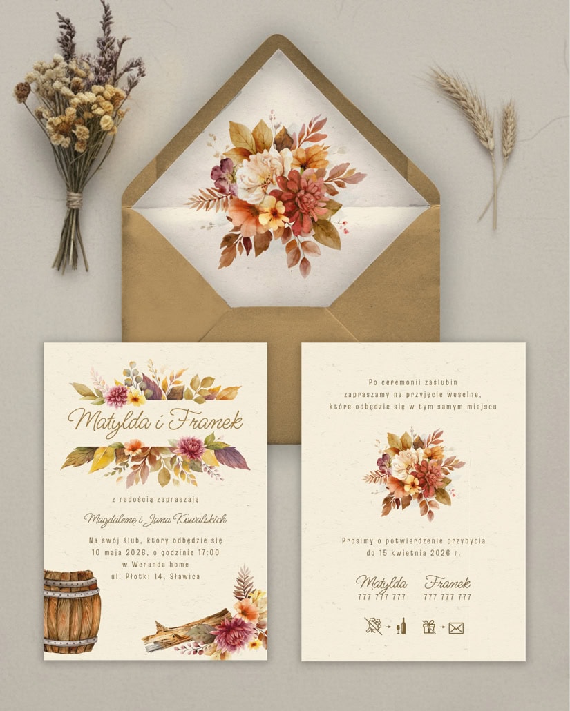 Przenieście się w czasie z naszymi zaproszeniami „W stylu vintage”, które emanują ciepłem, nostalgią i sielskim urokiem. Ten wyjątkowy projekt łączy w sobie bogatą, jesienną paletę barw – od burgundu, przez złoto, po głębokie brązy – z artystycznymi, akwarelowymi ilustracjami suszonych kwiatów, drewna i klimatycznej beczki. To idealna zapowiedź uroczystości w stylu rustykalnym, boho, w winnicy lub klimatycznej stodole, dla par ceniących ponadczasową elegancję z nutą retro.