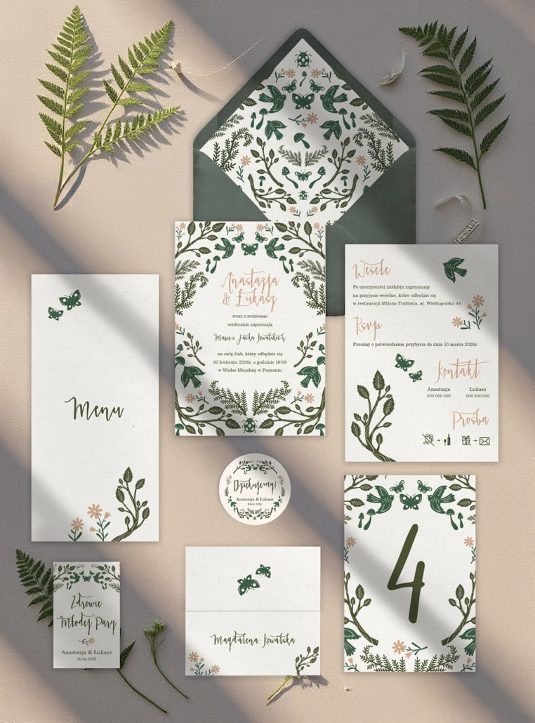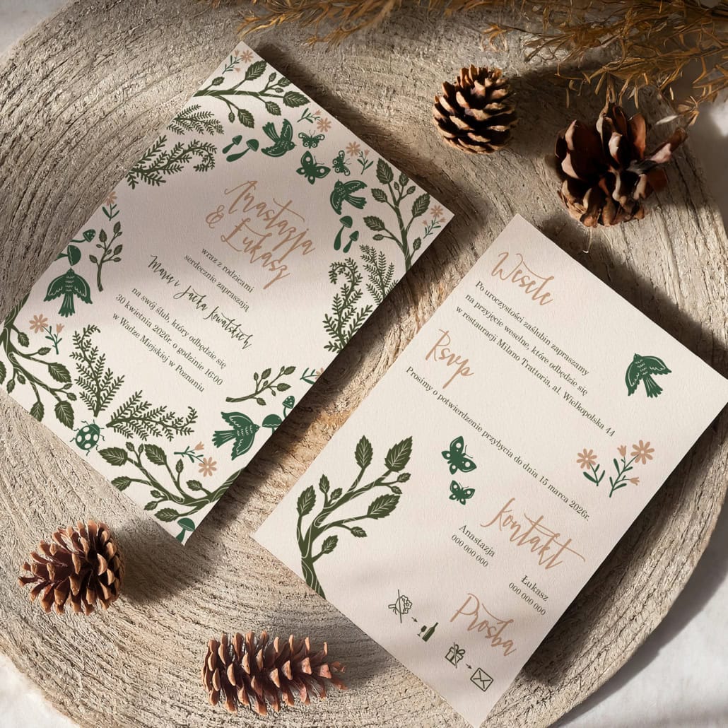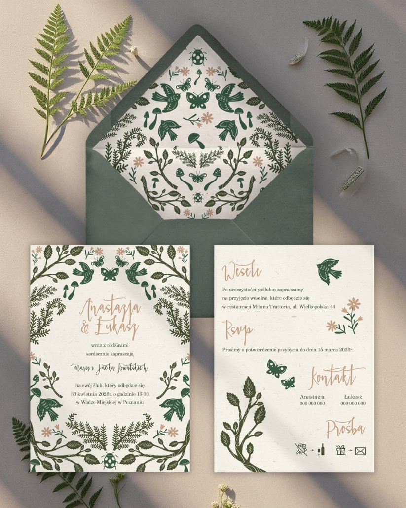 Odkryjcie magię „Zielonego folkloru” – zaproszenia, które przenoszą w świat leśnej baśni i sielskiego klimatu. Ten unikalny projekt łączy w sobie nowoczesne wzornictwo z elementami inspirowanymi naturą i folklorem. Autorskie ilustracje ptaków, motyli, grzybów i paproci, skąpane w głębokiej, eleganckiej zieleni, tworzą niezapomnianą kompozycję.