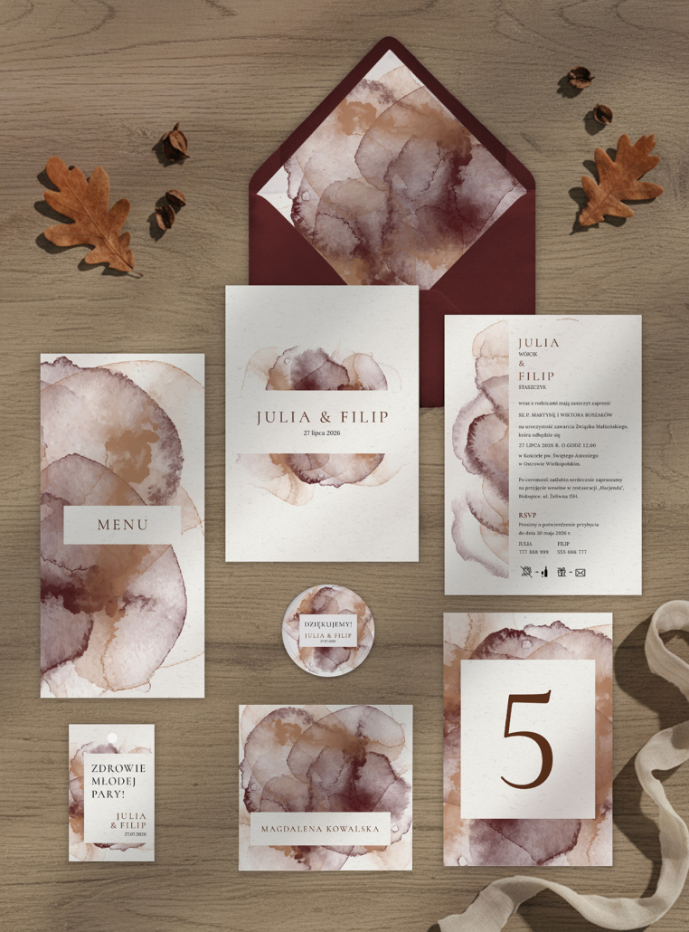 Koperty pasujące do zaproszenia: czerwone wino i kawowa.