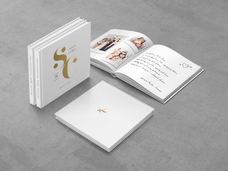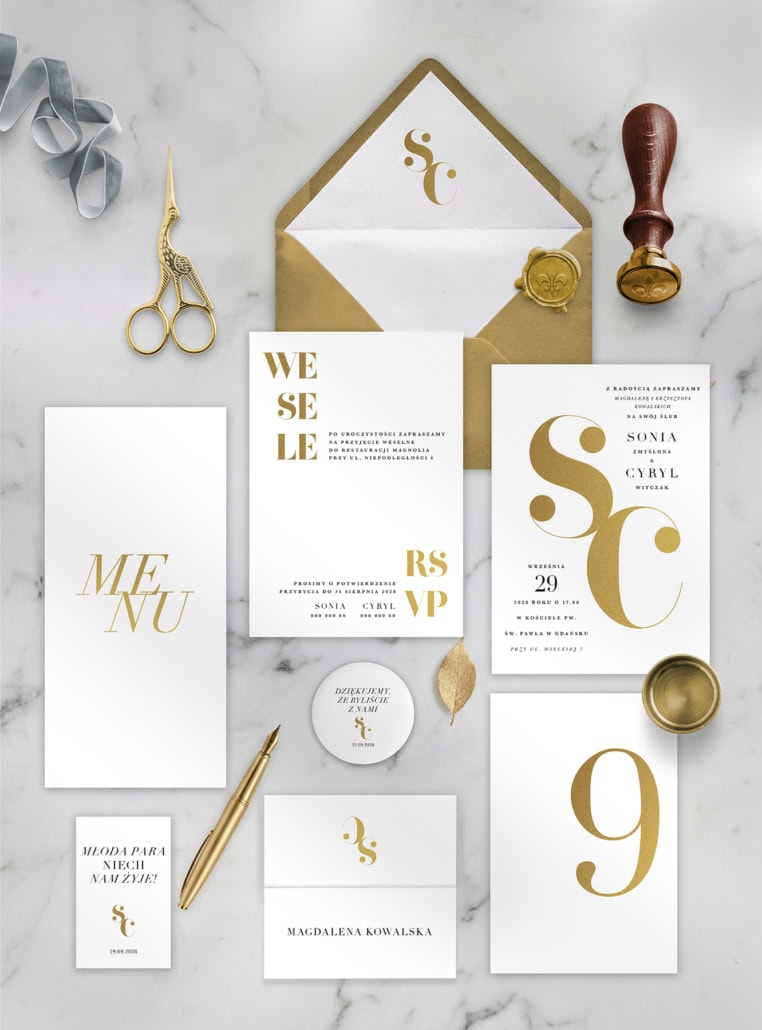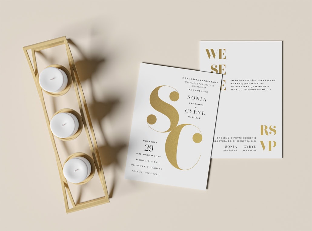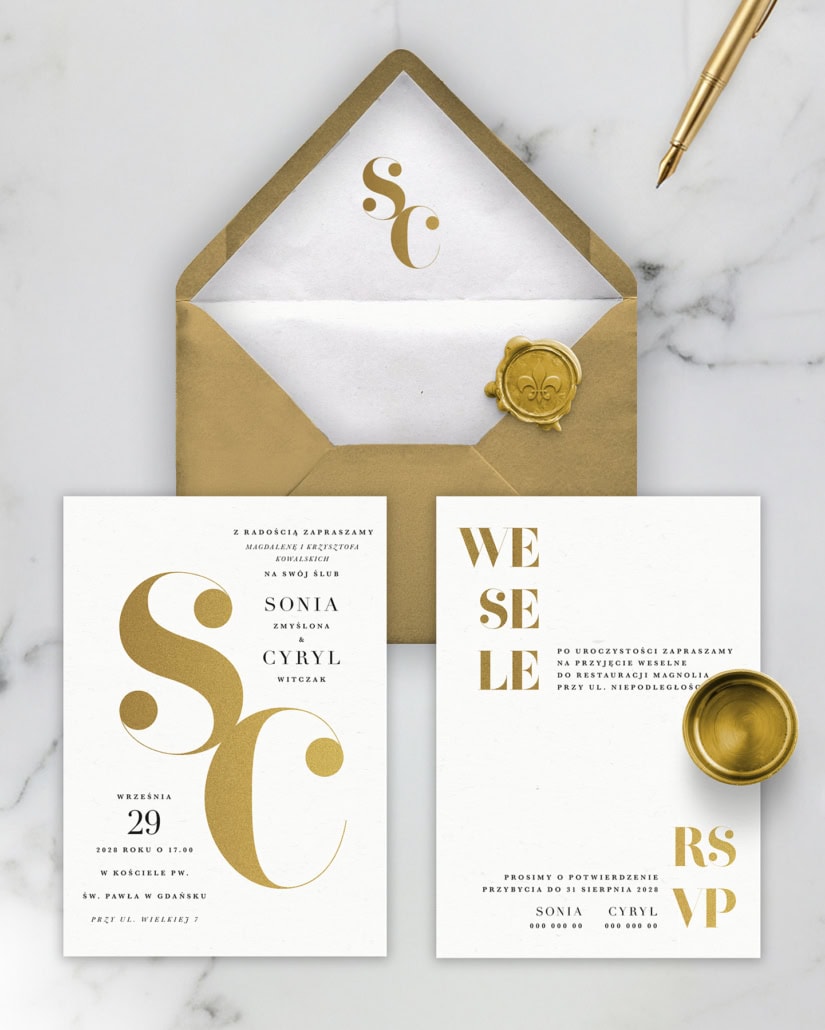 Kolekcja „Złote inicjały” to definicja nowoczesnego luksusu i minimalistycznej elegancji. Centralnym punktem projektu jest odważny, artystycznie spleciony monogram Waszych inicjałów, wykonany lśniącą, złotą folią.
